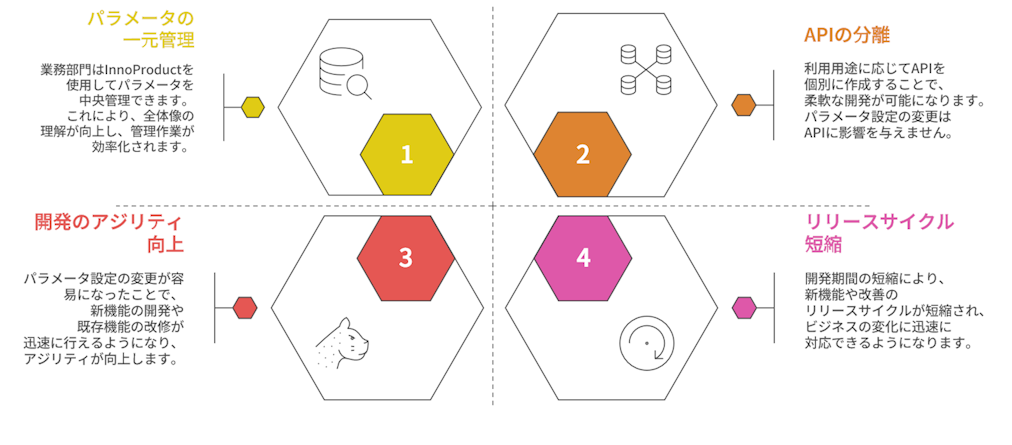 それまでお申込みなどがあったときには、それぞれの機能に対してパラメータのような形でマスターとして設定をしていましたが、InnoProductの導入によって、業務側で一元的に管理ができるようになりました。また、それぞれの利用用途に応じてAPIを作り分けることができますので、マイページなどのデジタルのチャネルがもつ機能ごとにパラメータの設定をする必要が無くなり、アジリティの高い開発ができるようになりました。そのため、開発にかかる人的リソースを減らすことができましたし、開発期間も従来と比べ短縮することができました。